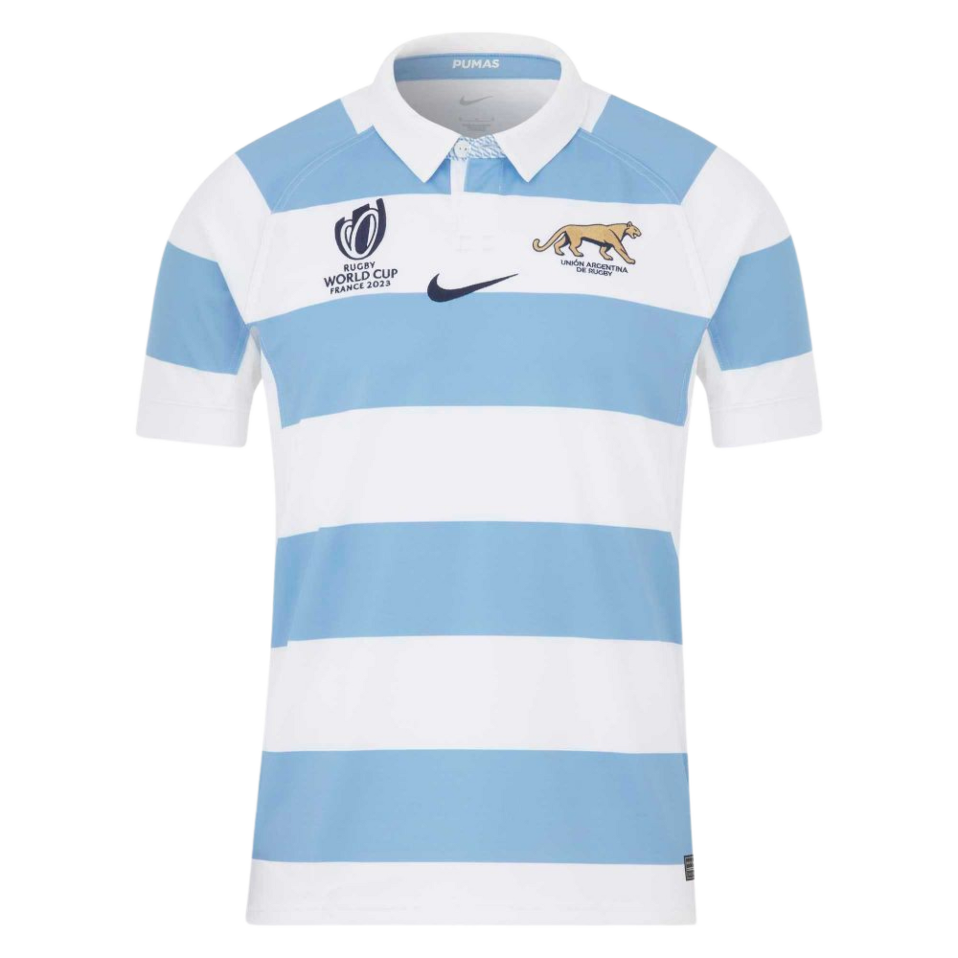 Classic Design with a Modern Touch: Inspired by Argentina’s traditional colors, the jersey features the iconic sky blue and white horizontal stripes – a symbol of unity and collective strength. The Los Pumas crest stands proudly on the chest, alongside the Nike logo and the official Rugby World Cup 2023 emblem, representing national pride and sporting excellence.